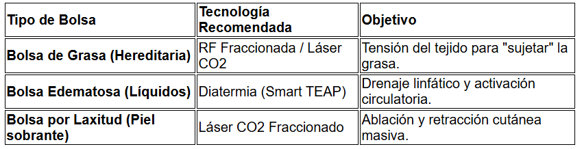 - Equipo Clave: La Smart TEAP (RF Resistiva-Capacitiva) trabaja a una frecuencia que respeta la fisiología ocular mientras moviliza los fluidos estancados que acentúan el volumen de la bolsa.
